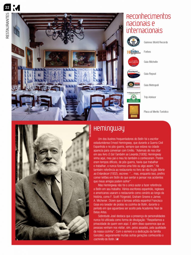 Um dos ilustres freqüentadores do Botín foi o escritor estadunidense Ernest Hemingway, que durante a Guerra Civil Espanhola e no pós-guerra, sempre que estava na cidade aparecia para conversar com Emílio. “Ademais de nos citar em seu livro O Sol Também se Levanta Hemingway vinha aqui, meu pai e meu tio também o conheceram. Porém eram tempos difíceis, de pós-guerra, havia que trabalhar e trabalhar, e nunca fizemos uma foto ou algo assim”. Sobretudo José destaca que a presença de personalidades nunca foi utilizada como forma de divulgação: “Respeitamos a privacidade de quem vem aqui. E além disso queremos que as pessoas venham nos visitar sim pelos assados, pela qualidade da nossa cozinha”. Com o esmero e a dedicação da família González, seguramente muitas outras gerações conhecerão o cochinillo do Botín.