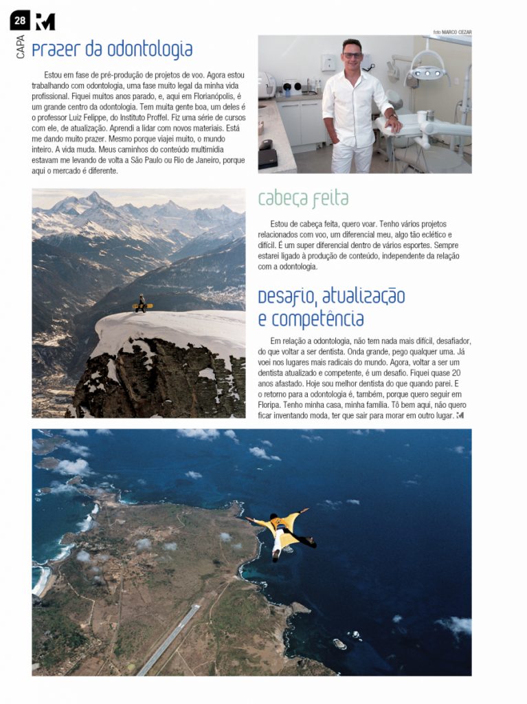 Estou de cabeça feita, quero voar. Tenho vários projetos relacionados com voo, um diferencial meu, algo tão eclético e difícil. É um super diferencial dentro de vários esportes. Sempre estarei ligado à produção de conteúdo, independente da relação com a odontologia.