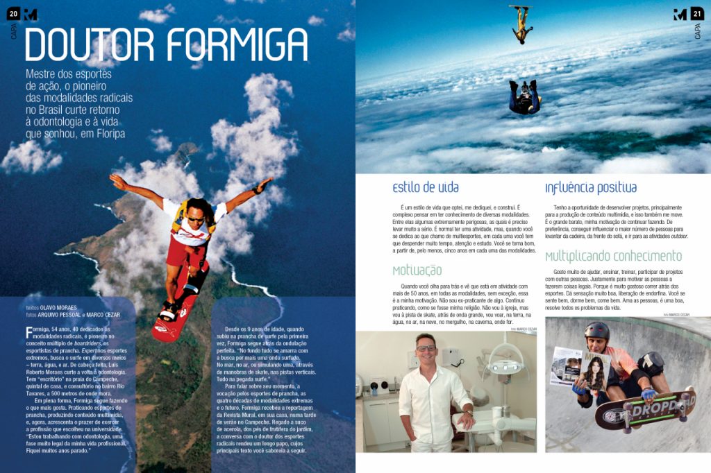 Para falar sobre seu momento, a vocação pelos esportes de prancha, as quatro décadas de modalidades extremas e o futuro, Formiga recebeu a reportagem da Revista Mural, em sua casa, numa tarde de verão no Campeche. Regado a suco de acerola, dos pés de frutífera do jardim, a conversa com o doutor dos esportes radicais rendeu um longo papo, cujos principais texto você saboreia a seguir.