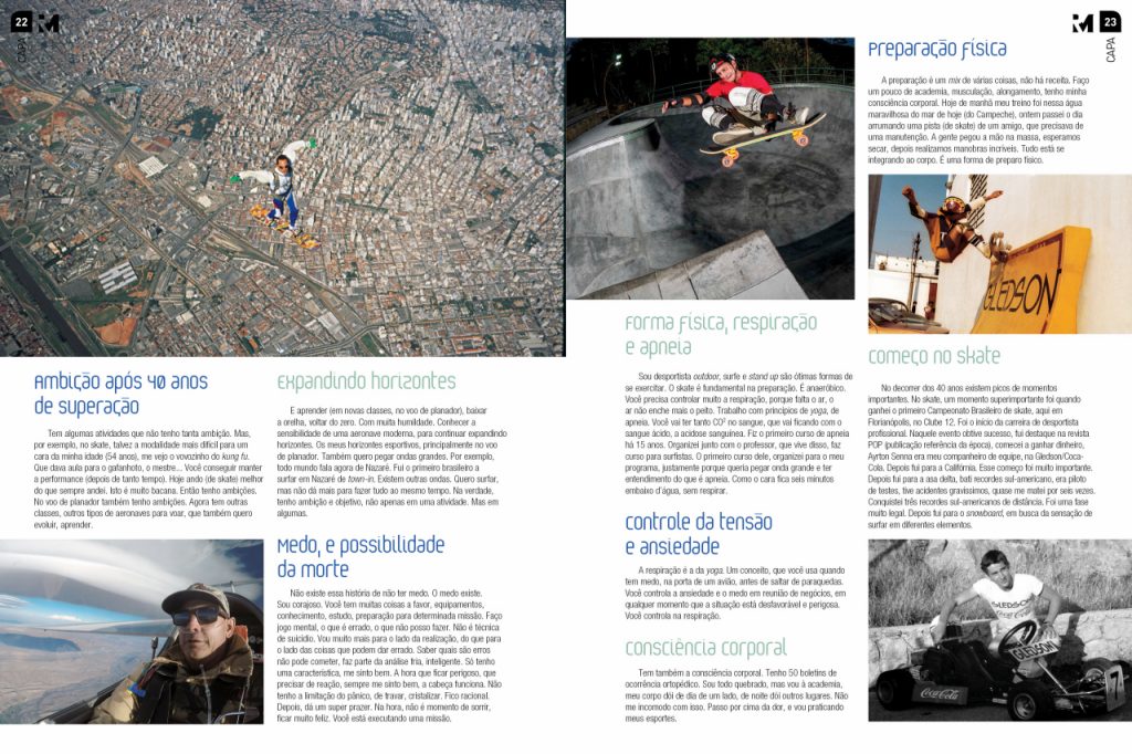 Tem algumas atividades que não tenho tanta ambição. Mas, por exemplo, no skate, talvez a modalidade mais difícil para um cara da minha idade (54 anos), me vejo o vovozinho do kung fu. Que dava aula para o gafanhoto, o mestre… Você conseguir manter a performance (depois de tanto tempo). Hoje ando (de skate) melhor do que sempre andei. Isto é muito bacana. Então tenho ambições. No voo de planador também tenho ambições. Agora tem outras classes, outros tipos de aeronaves para voar, que também quero evoluir, aprender.
