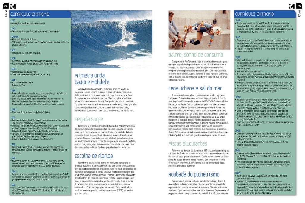 No decorrer dos 40 anos existem picos de momentos importantes. No skate, um momento superimportante foi quando ganhei o primeiro Campeonato Brasileiro de skate, aqui em Florianópolis, no Clube 12. Foi o início da carreira de desportista profissional. Naquele evento obtive sucesso, fui destaque na revista POP (publicação referência da época), comecei a ganhar dinheiro, Ayrton Senna era meu companheiro de equipe, na Gledson/Coca-Cola. Depois fui para a Califórnia. Esse começo foi muito importante. Depois fui para a asa delta, bati recordes sul-americano, era piloto de testes, tive acidentes gravíssimos, quase me matei por seis vezes. Conquistei três recordes sul-americanos de distância. Foi uma fase muito legal. Depois fui para o snowboard, em busca da sensação de surfar em diferentes elementos.