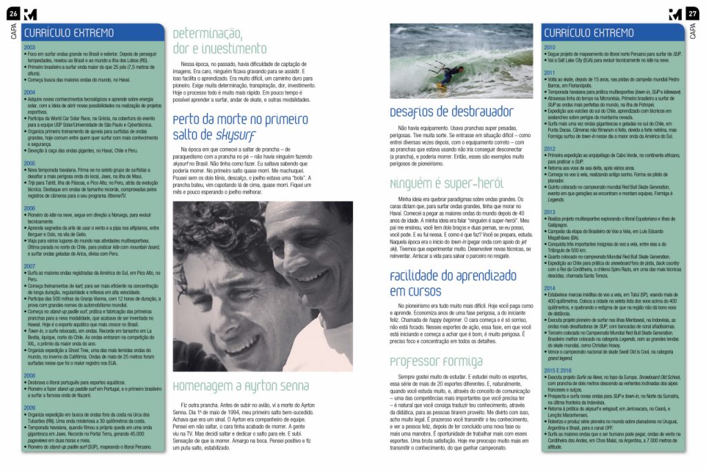 É um estilo de vida que optei, me dediquei, e construí. É complexo pensar em ter conhecimento de diversas modalidades. Entre elas algumas extremamente perigosas, as quais é preciso levar muito a sério. É normal ter uma atividade, mas, quando você se dedica ao que chamo de multiesportes, em cada uma você tem que despender muito tempo, atenção e estudo. Você se torna bom, a partir de, pelo menos, cinco anos em cada uma das modalidades.